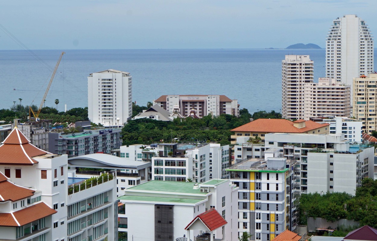 - Blick zum Hotel (das flachere Gebäude in der Bildmitte hinten), dahinter das Regattagebiet