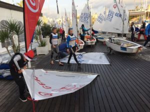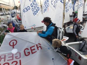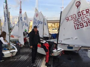 Die TOP 3: EVA SCHAFER RODRIGUEZ/ESP (2,1,1); Paul Mesquida/ESP (1,4,2); Malthe Ebdrup/DEN (5,2,1).Aus Palma erreichte uns dieser Kurz-Bericht: Der Tag begann mit Hektik gegen, 7.30 Uhr waren wir im Hafen. Die Kinder ,unterstützt von Eltern und Trainern, bauten die Segel und Boote auf . Eine Steuermannsbesprechung wie in Deutschland üblich gab es nicht . Austragen, Boote slippen und los ging’s auf Wasser. Gestartet wurde mit Flagge U, es gab viele UFD. Gegen 15.20 Uhr ging’s an Land. Am morgigen Sonnabend ist der Start für 10.30 Uhr geplant.