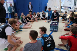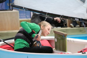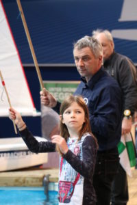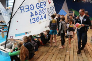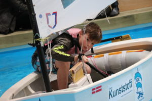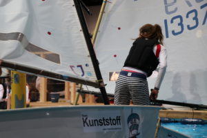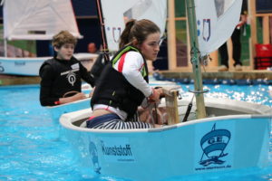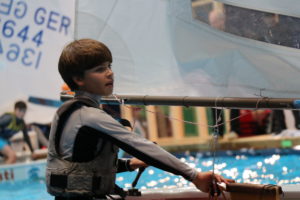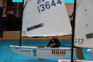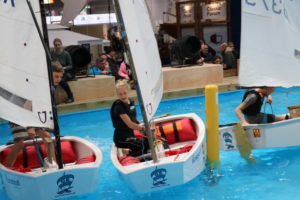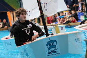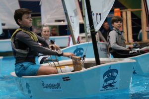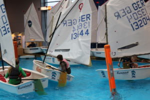(bmg) Endlich mal wieder Regatta segeln … diese Chance gab´s für 22 Optisegler auf der boot Düsseldorf 2018. Das Revier: ein 25x10m großes Wasserbecken in Halle 14 – ein bisschen klein. Aber: total zuverlässig in Stärke und Richtung war der Wind aus den Windmaschinen am Beckenrand. Die Regattateilnehmer: Jannnik, Karl, Gioia, Amelie (Preisträger des Eiermann Opti B-Cup 2017); Jakob, Johanna, David, Fridolin (Gewinner des German Team Cup 2017); Kristian, Mewes, Luca, Anna (WM-Teilnehmer 2017); Michael, Florian, Cosima, Katharina, Louisa, Ansgar (EM-Teilnehmer 2017); Mic, Ole, Carl (IDJüM-Preisträger 2017); Caspar,Leon (Ersatzsegler). Das Programm: 5 Qualifikationsläufe, 1 Finale für die 5 Sieger der Vorläufe.