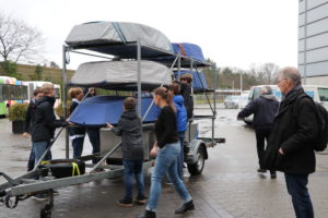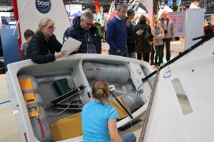 Stressiger Regattaauftakt: OPTI-Anhänger und Zugfahrzeug, am Steuer Technikobmann Uwe Ochmann, werden trotz Parkkarte nicht auf das boot-Gelände vor der Halle 14 gelassen. Nicht das komplette Gespann, nur der Anhänger dürfte rein … In Halle 14 wird die Regatta schon mal angekündigt, aber noch wird am Tor um die Einfahrt gekämpft. 30 Minuten vor dem Start „grünes“ Licht. Das Abladen gelingt blitzschnell, mit viel Hilfe. Kleine Herausforderung und Zeitverzögerung: Eine Metallkiste mit Riggs und Segel lässt sich nicht öffnen. Metallsäge organisieren, die Zeit läuft …. 10 Minuten vorm Start sind 5 Boote vorbereitet, mit den Aufklebern der Förderer „Team Kunststoff“ und „Bootsservice Gerd Eiermann“ versehen. Steuermannsbesprechung. Das Wichtigste: Trotz des leichten Windes auf keinen Fall mit vollem Schwert fahren, der Boden des Wasserbeckens würde „aufgesägt“ werden, die Halle 14 geflutet ….