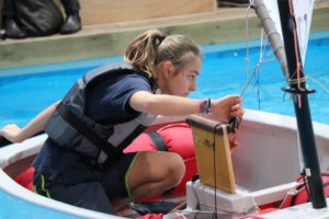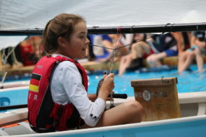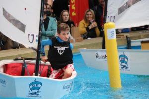 Kreuz-Vorwindkurs-Kreuz-Vorwind ins Ziel …Caspar ist der Schnellste des 1. Rennens. Florian hätte auch gewinnen können, aber er musste Kringel drehen. Wriggen ist auch auf dem Mini-Becken nicht erlaubt.