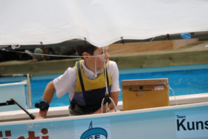 Das letzte Qualifikationsrennen bestreiten Johanna, David, Fridolin – alle Drei gehören zum Siegerteam des German Team Cup 2017, mit dabei sind auch Karl und Leon. Leon ist mit 10 Jahren der Jüngste dieser indoor-Regatta. Johanna führt bei der ersten Umrundung der Luvtonne und behält den Bug vorn. Die Moderatoren am Beckenrand sind begeistert: Wieder gewinnt ein Mädchen – das Becken, die Windbedingungen scheinen hier für sie wie gemacht …