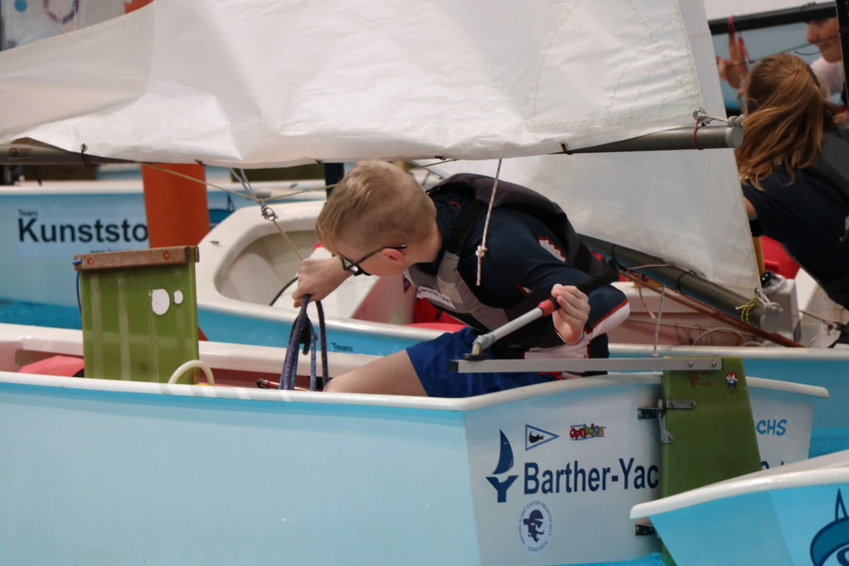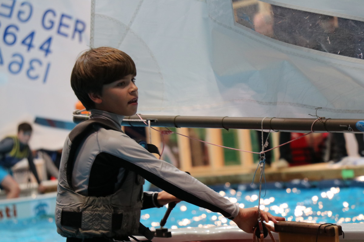 Das letzte Qualifikationsrennen bestreiten Johanna, David, Fridolin – alle Drei gehören zum Siegerteam des German Team Cup 2017, mit dabei sind auch Karl und Leon. Leon ist mit 10 Jahren der Jüngste dieser indoor-Regatta. Johanna führt bei der ersten Umrundung der Luvtonne und behält den Bug vorn. Die Moderatoren am Beckenrand sind begeistert: Wieder gewinnt ein Mädchen – das Becken, die Windbedingungen scheinen hier für sie wie gemacht …