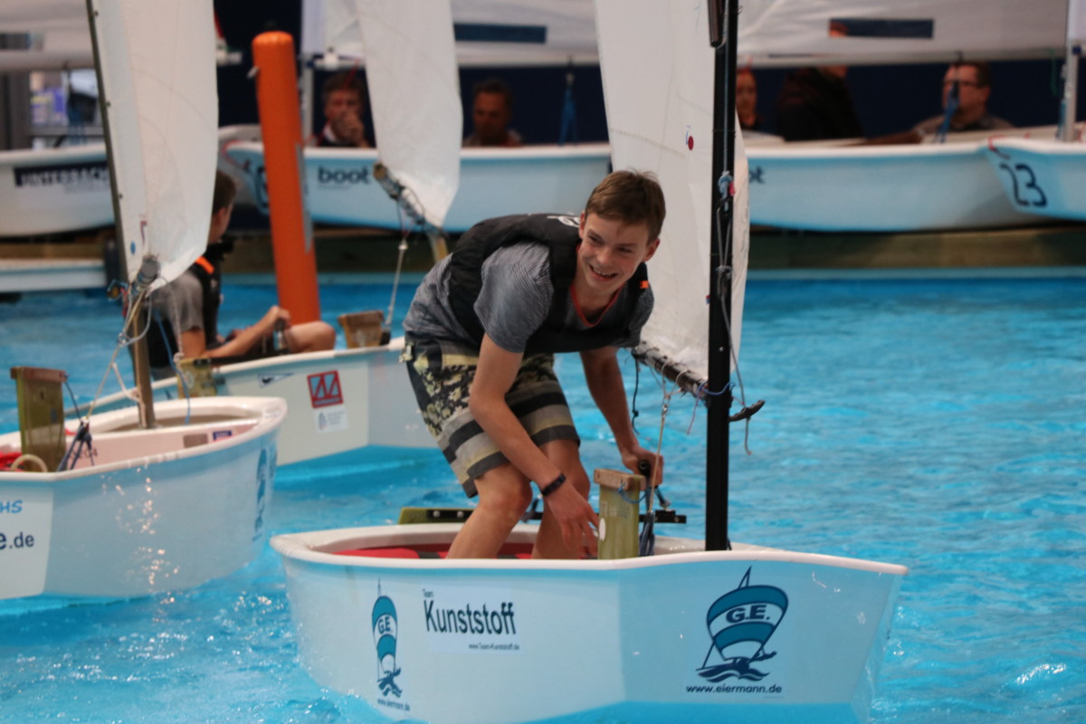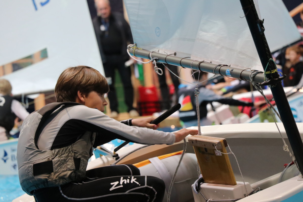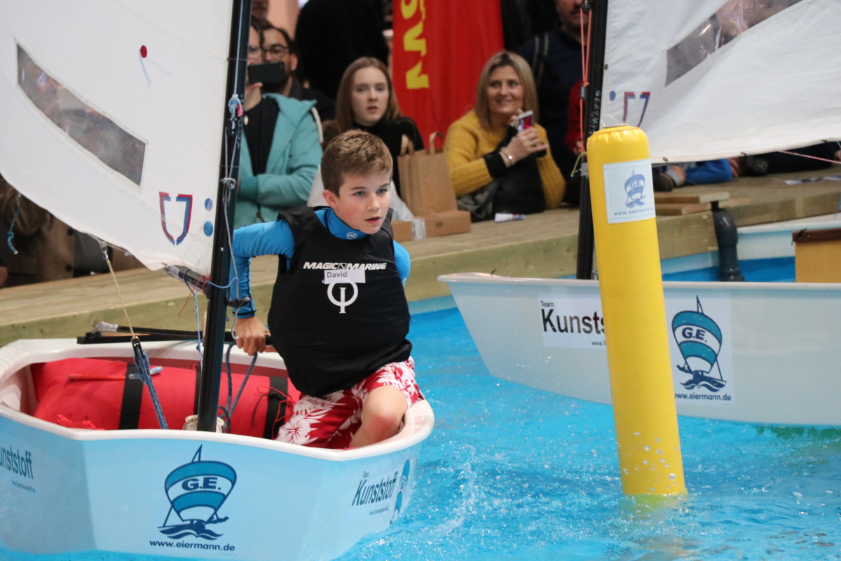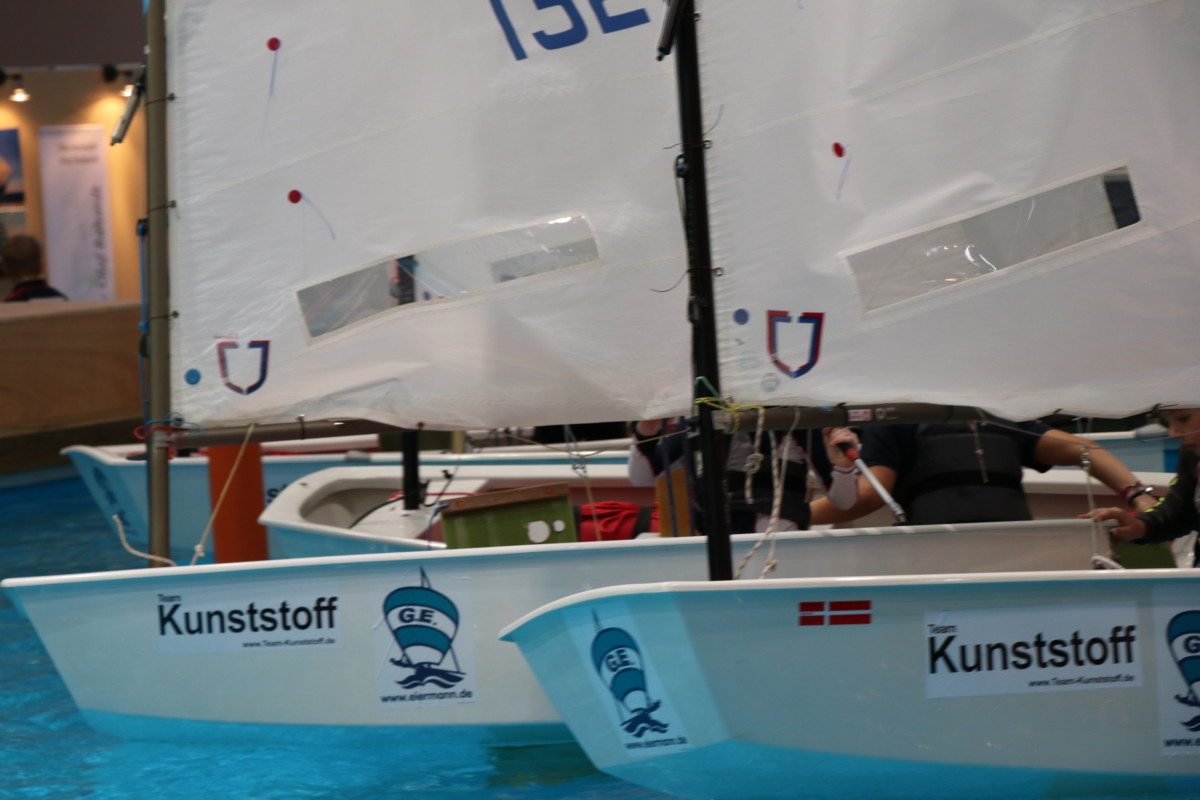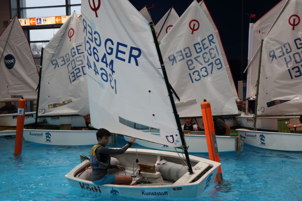 (bmg) Endlich mal wieder Regatta segeln … diese Chance gab´s für 22 Optisegler auf der boot Düsseldorf 2018. Das Revier: ein 25x10m großes Wasserbecken in Halle 14 – ein bisschen klein. Aber: total zuverlässig in Stärke und Richtung war der Wind aus den Windmaschinen am Beckenrand. Die Regattateilnehmer: Jannnik, Karl, Gioia, Amelie (Preisträger des Eiermann Opti B-Cup 2017); Jakob, Johanna, David, Fridolin (Gewinner des German Team Cup 2017); Kristian, Mewes, Luca, Anna (WM-Teilnehmer 2017); Michael, Florian, Cosima, Katharina, Louisa, Ansgar (EM-Teilnehmer 2017); Mic, Ole, Carl (IDJüM-Preisträger 2017); Caspar,Leon (Ersatzsegler). Das Programm: 5 Qualifikationsläufe, 1 Finale für die 5 Sieger der Vorläufe.