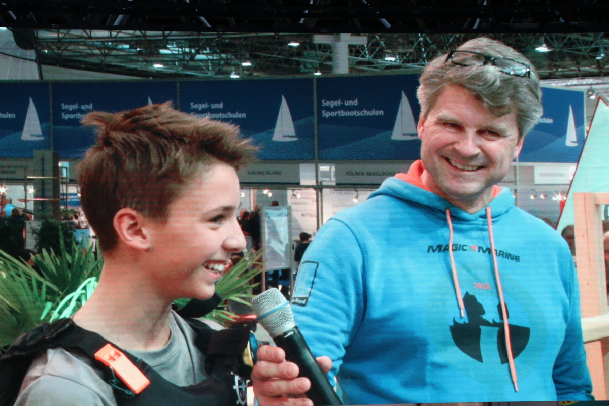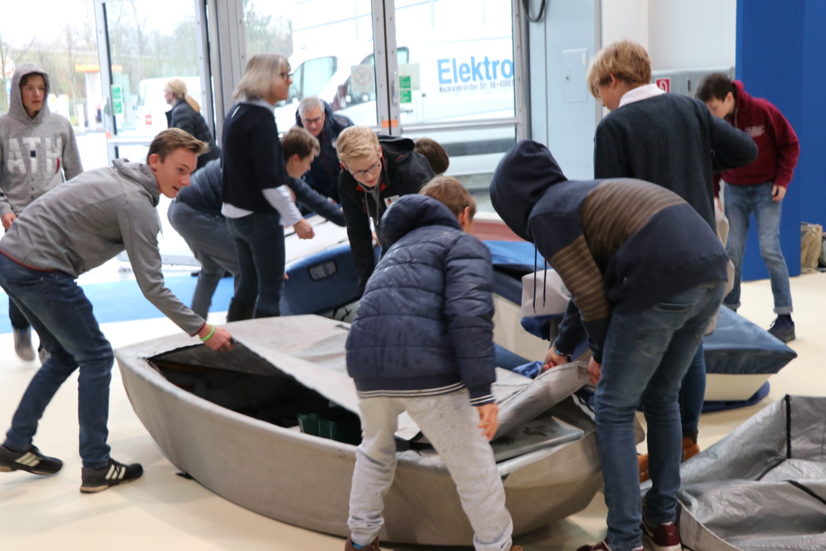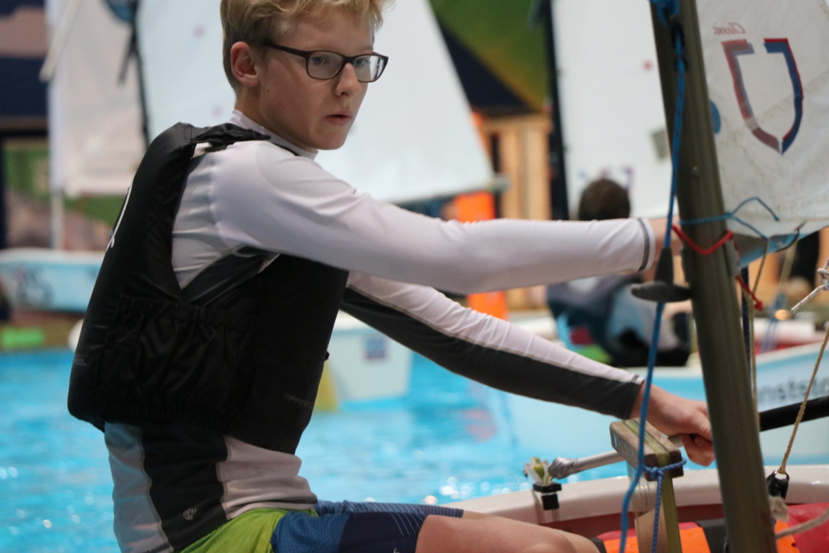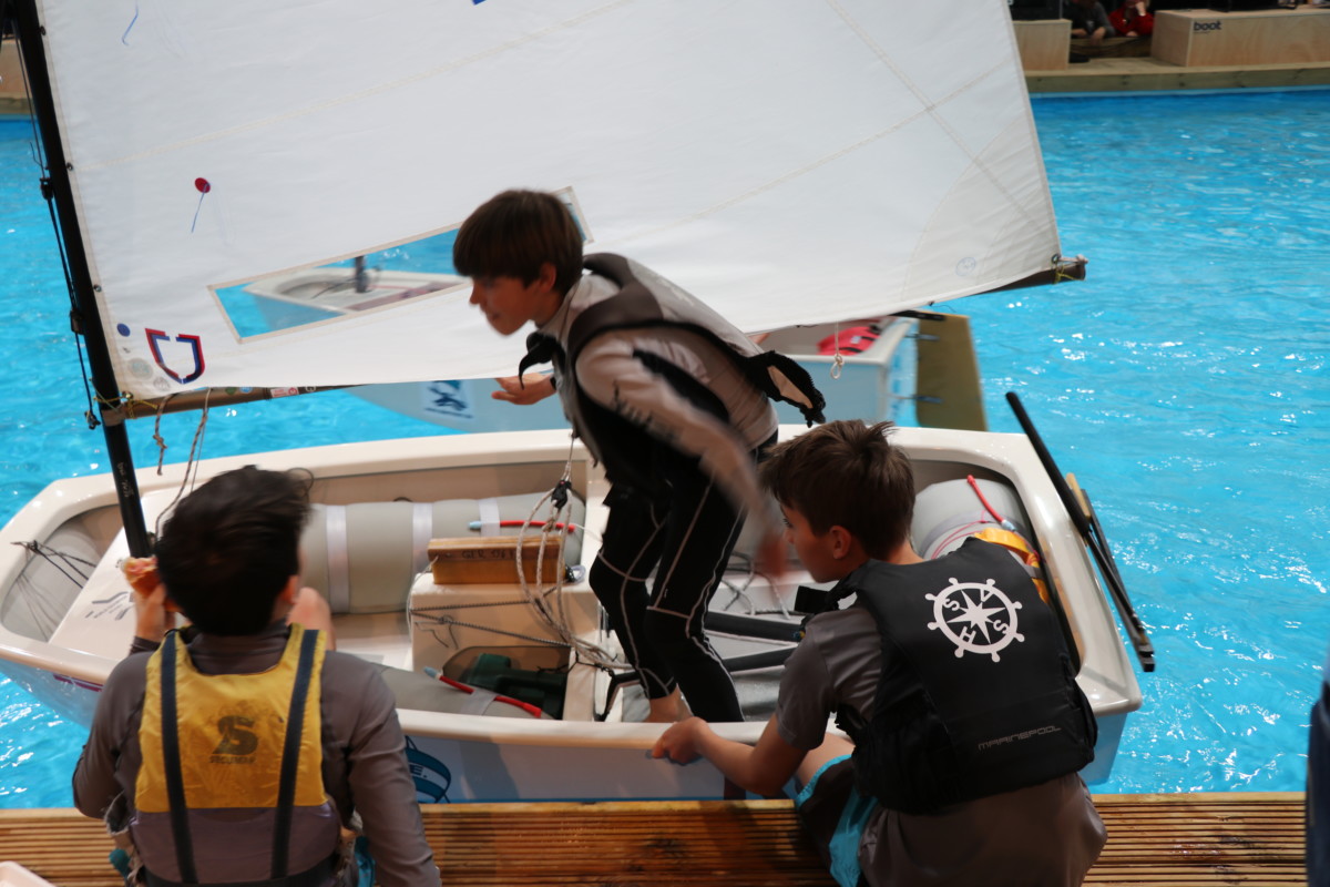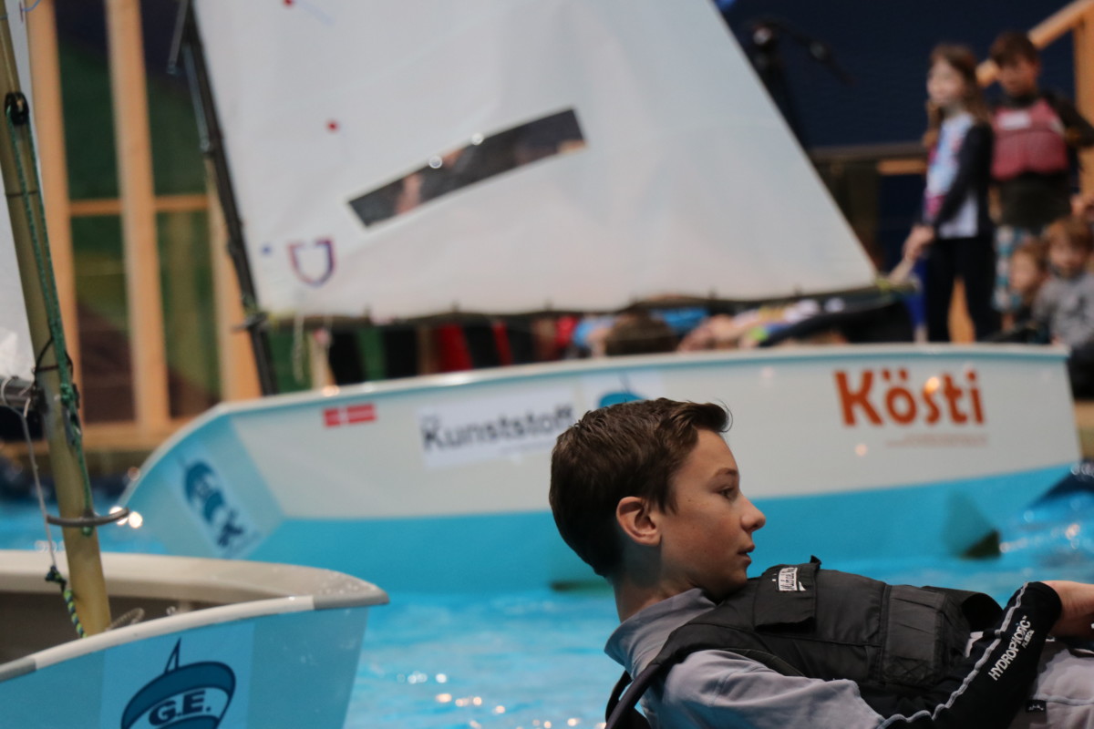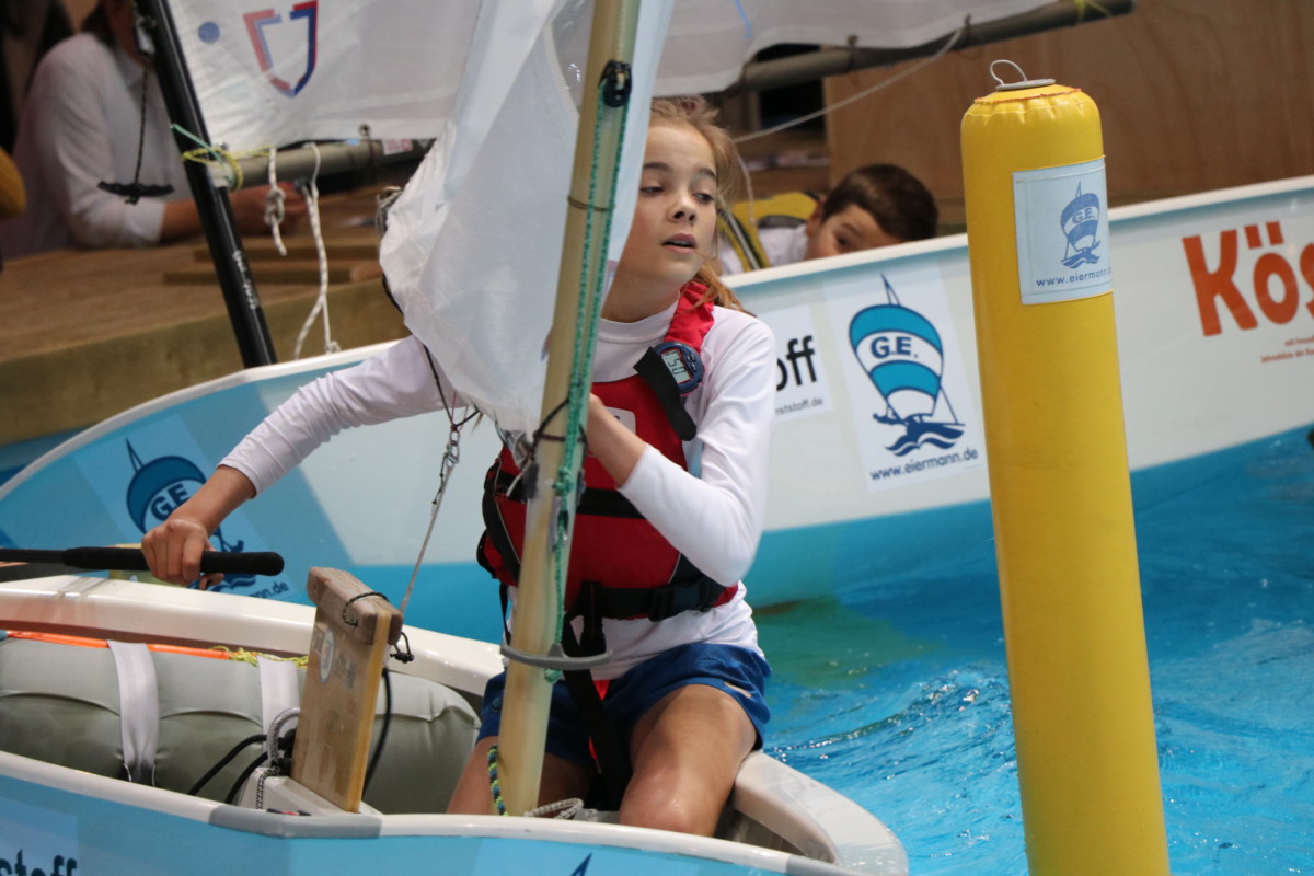 (bmg) Endlich mal wieder Regatta segeln … diese Chance gab´s für 22 Optisegler auf der boot Düsseldorf 2018. Das Revier: ein 25x10m großes Wasserbecken in Halle 14 – ein bisschen klein. Aber: total zuverlässig in Stärke und Richtung war der Wind aus den Windmaschinen am Beckenrand. Die Regattateilnehmer: Jannnik, Karl, Gioia, Amelie (Preisträger des Eiermann Opti B-Cup 2017); Jakob, Johanna, David, Fridolin (Gewinner des German Team Cup 2017); Kristian, Mewes, Luca, Anna (WM-Teilnehmer 2017); Michael, Florian, Cosima, Katharina, Louisa, Ansgar (EM-Teilnehmer 2017); Mic, Ole, Carl (IDJüM-Preisträger 2017); Caspar,Leon (Ersatzsegler). Das Programm: 5 Qualifikationsläufe, 1 Finale für die 5 Sieger der Vorläufe.