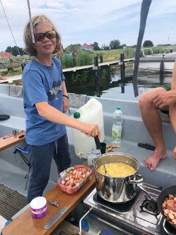 Wie gut, dass Oswins Großmutter in dem Hiddensee Ort Klosters wohnt. Sie stiftete für die Mittagsmahlzeit eine Riesenportion Klopse. Franz und Oswin ging ein großer Barsch an die Angel. Er wurde gegrillt und war eine Erweiterung des Abendessens: Kartoffelsuppe mit Möhren und Würstchen, frisch zubereitet, nur für die Würstchen wurde eine Dose geöffnet.