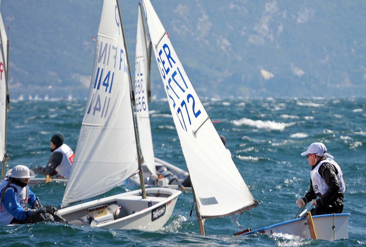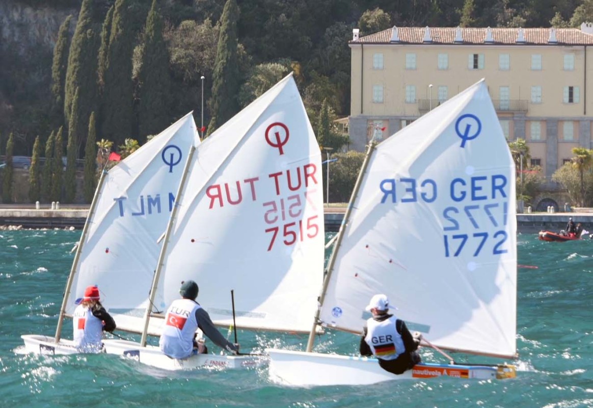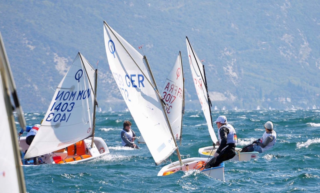 (bmg) Immer 24 Knoten, in Böen auch mehr, dazu eine kabbelige, steile Welle – harte Bedingungen beim 9. MEETING COUNTRY CUP am gestrigen Nachmittag vor der Eröffnungsfeier des 41. LAKE GARDA MEETING OPTIMIST. Die hochkarätigen 32 Starter aus 32 Nationen segelten 3 Rennen von ca. 30 Minuten Dauer bei sehr kräftiger Ora.