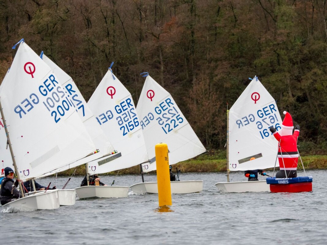Für Wettfahrtleiter Lasse Paland war der Start in den Tag eine Herausforderung. Da der Wind überwiegend aus Süden kam und der See in seinem Verlauf einen „Knick“ hat, bedeutete dies für Lasse, dass er mit dem Regattafeld in den Süden des Sees ausweichen musste. Denn: Der See ist zwar sehr schmal, dafür aber stattliche 7,8 km lang. Für die Kids bedeutete das eine 1,5 km lange „Anreise“ ins Regattagebiet.Belohnt wurde der lange Weg mit 8-10 Knoten aus Südwest, sodass alle Gruppen drei spannende Läufe segeln konnten. Zwischen den Wettfahrten gab es warmen Punsch vom Mobo, nach den Wettfahrten kam sogar der Nikolaus aufs Wasser und verteilte Schokolade.